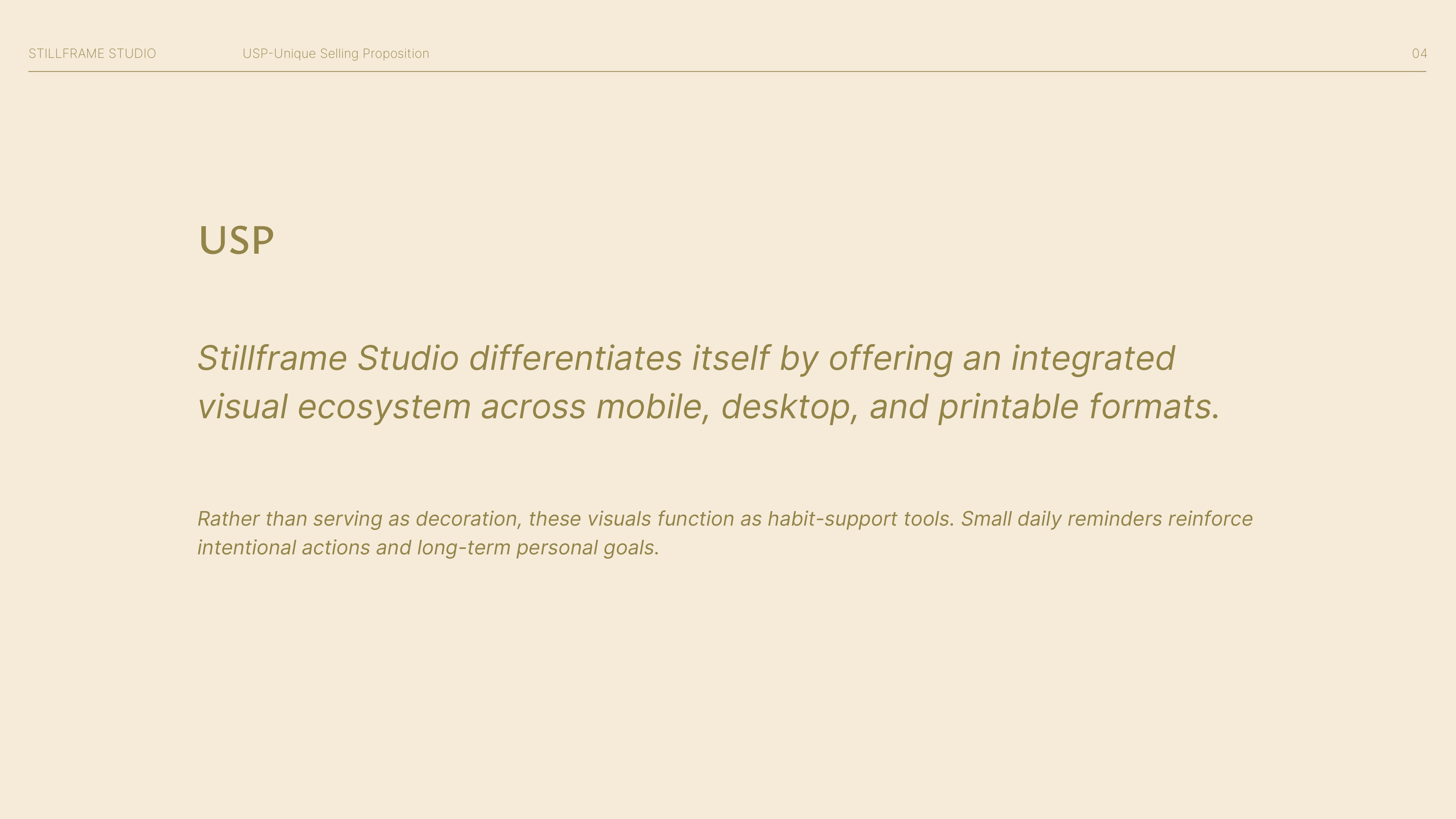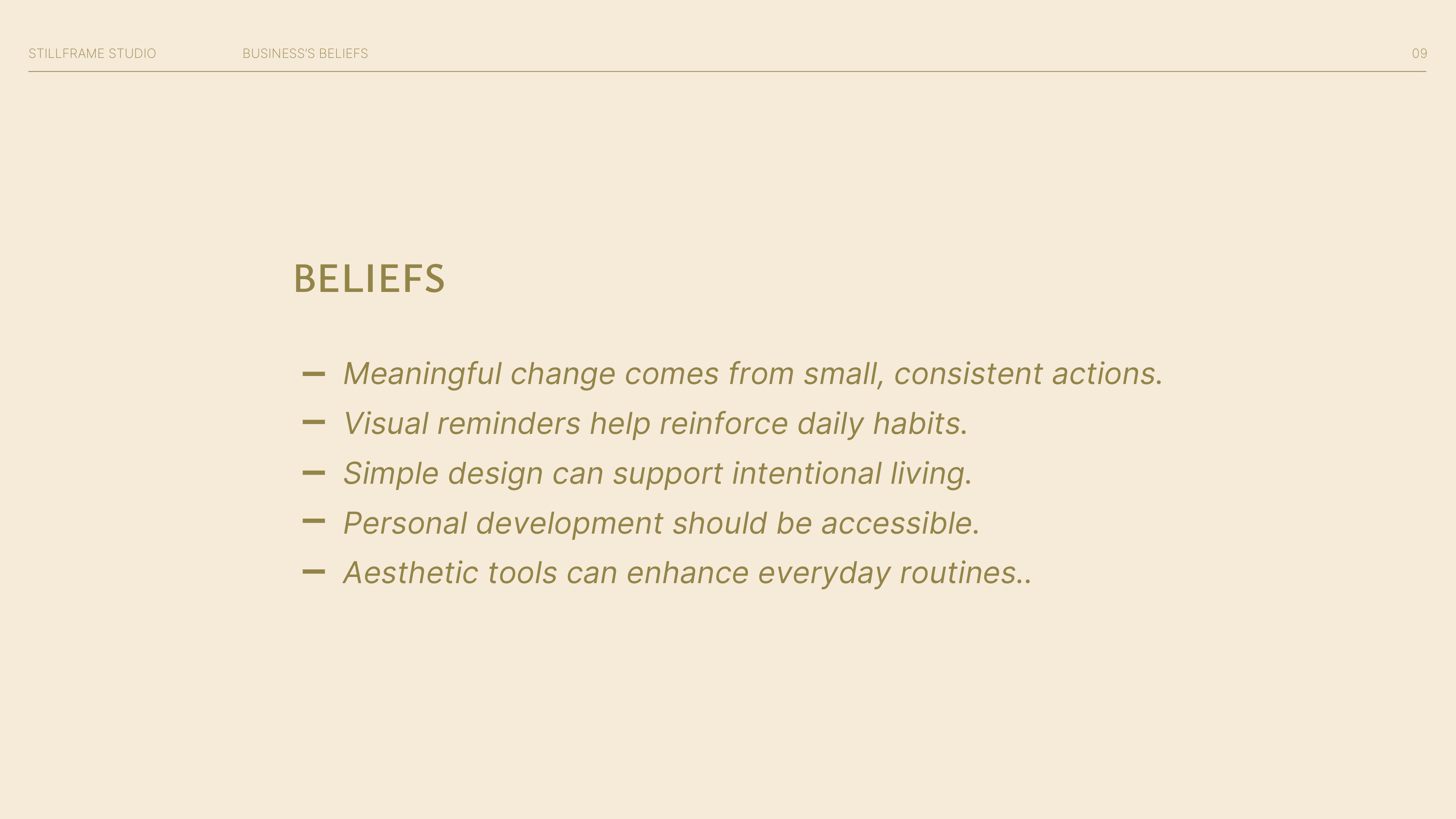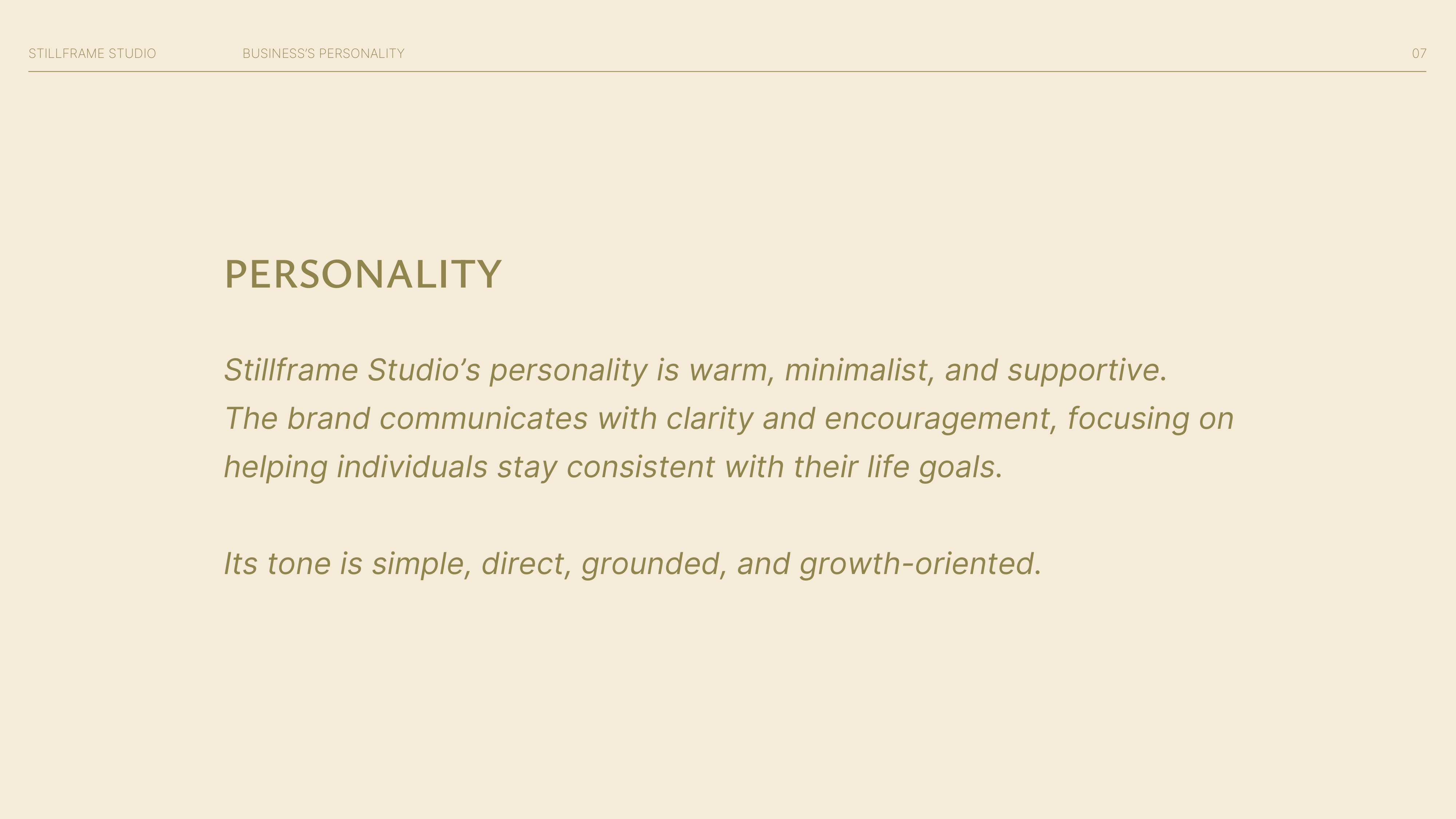 StillFrame Studio is a personal brand concept developed to explore how visual identity can support intentional living through calm, focused design.
